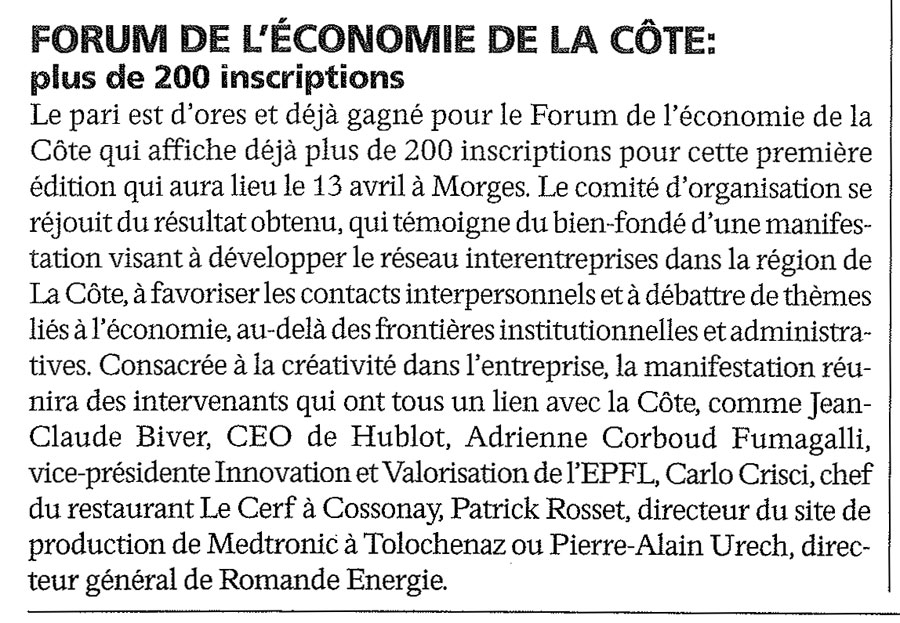 Forum de l'économie de La Côte: plus de 200 inscriptions
